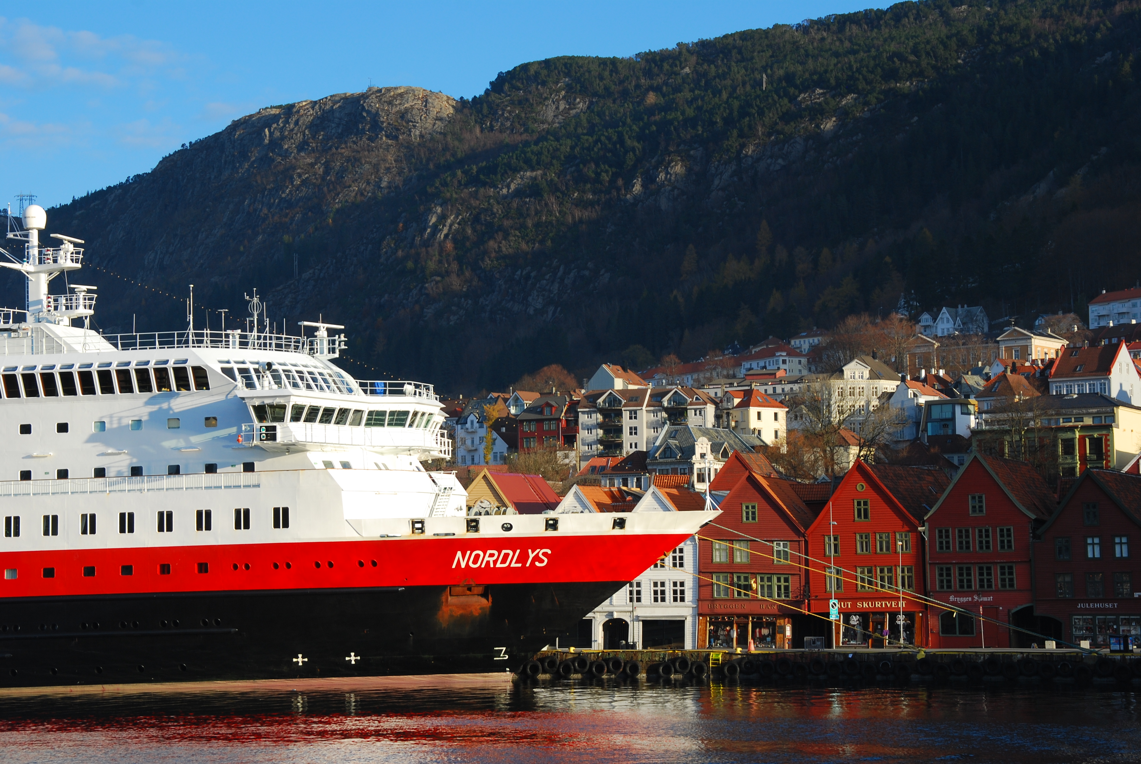 During winter, the daily coastal ships still constitute the only transport and freight link to many small towns, as a glance at the cargo cranes on deck confirm.